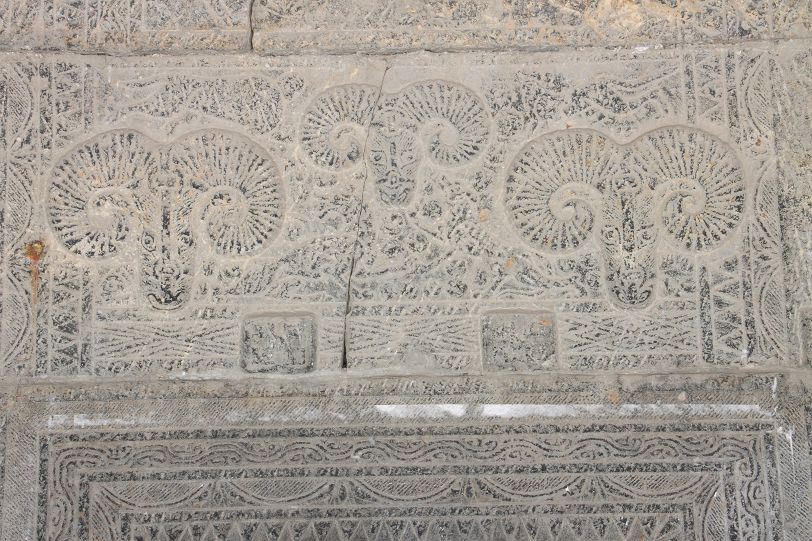 门楣最上方条石上三边有边栏,分别饰垂幛纹、三角纹,栏内铲地浅浮雕出左白虎右青龙,中间有一小亭。青龙白虎昂首欲飞,动感强烈。门楣中部条石上,两边饰宽带纹、垂幛纹和三角纹。画面主体为三羊头,两边羊头大,中间羊头小,羊头面部 刻穿璧纹。羊头上方刻有两人面兽,羊头下方为二狐相对而坐。整个画面饰以圆钉纹。门楣最下条石边栏分别雕刻宽带纹、垂幛纹和三角纹。画面主体为车马出行图,前面为骑马吏做引导,后面四维轺车一辆,车上坐驭一人,车马前方有一小门。二马昂首疾驶,人物均作紧急情状,可能是执行紧要公务。轺车是 一匹马驾的轻便车,也是奉使者和朝廷急命宣召者所乘的车。此幅画面用阴线雕刻,线条细致流畅,比例匀称,充分体现了画工的高超技巧。墓门两边门柱画像采用铲地浮雕技法,雕一对门吏。门吏上部有边栏,纹饰为垂幛纹、宽带纹、三角纹。左边门柱刻一拥彗 门吏,门吏脸部采用凿地凹面线刻技法,大眼细眉,身穿宽袍,大襟右衽,交领大袖,博衣裹带,头戴却非冠 ,左手握长彗,右手放胸前,上身微躬,侧身而立。右边门柱刻一文职门吏,浓眉朗目,长袍宽带,头戴笼冠,侧身恭立 ,目视前方。两门吏头部外侧分别刻一鱼鹰,脚下刻鲤鱼,两两相向,十分对称。鱼鹰与鱼象征生活美满富裕。墓门的门额处塑出 羊头,都是模拟当时人们祈福求富的习俗,和鱼鹰、鱼一样都具有象征意义。门扉画像石主要采用铲地浅浮雕的技法,雕刻铺首衔环。铺首为人面兽型,头戴山字型高冠,上方刻有 两只凤鸟,引颈欲飞。铺首口衔圆环,环下系绶带。两门扉的构图各为画面 的一半,当两门关闭后,可形成一副完整画面。画面四周有两道边栏,分别刻有带型纹、三角纹饰。