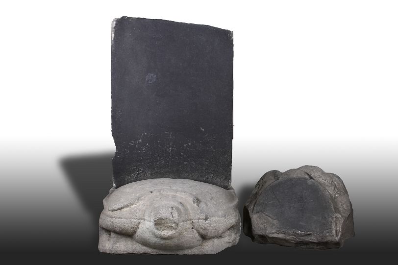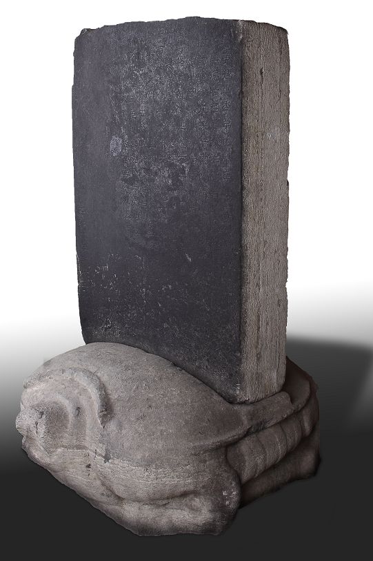 “王舍人碑”龟趺,长125厘米,宽90厘米,高33厘米。孤背浑圆,四足劲蹬,呈爬伏状。翘首扭尾,神态自溢。龟盖起凸弦线,线条流畅,栩栩如生。实属难得的一件精巧石雕艺术品。惜龟首有残。