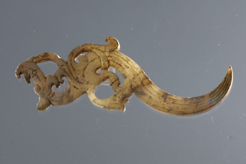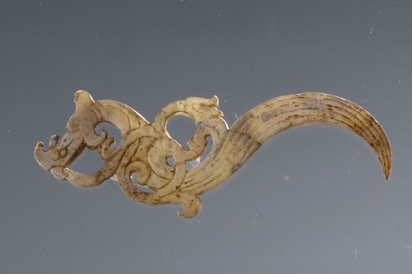 平度市博物馆馆藏西汉时期玉觹,2000年出土于平度市灰埠镇界山汉墓。与其他玉佩饰玉环、玉珠、玉带钩等一起出土于墓主人的胸部。玉觹用白玉制成,似鸟状,有阴刻纹饰,通体镂雕。长尾弧卷,两侧阴刻线纹;高冠勾喙,短翅长尾,飘逸洒脱,舒展的长尾自然弯曲,翅翎有合有分。玉觹的形像美丽、精巧,玉质白皙苍古,沁色自然。