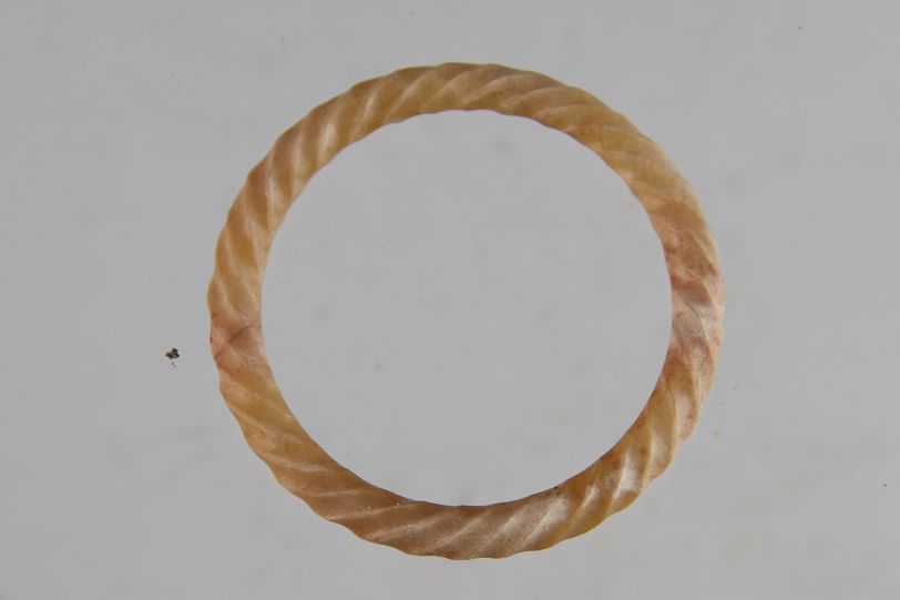 出土时位于墓主人的胸部,与其他玉佩饰连在一起,穿绳已朽。扭丝环为白玉,呈圆体环状,如绞拧的绳索,俗称扭丝纹。玉石色泽呈白灰色,有钙化和土沁现象,包浆古朴自然;刀工起落有致,遒劲有力,线条规整,抛光精致,显得纹丝不乱。