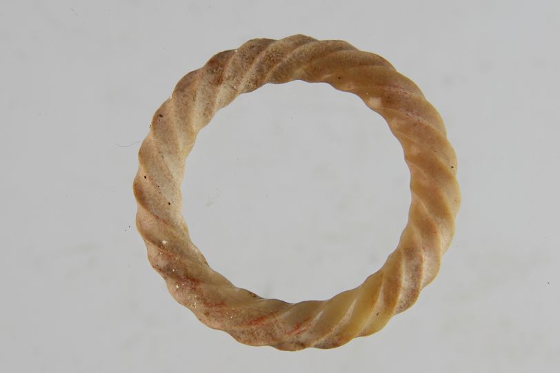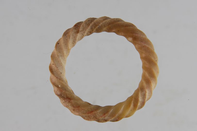 出土时位于墓主人的胸部,与其他玉佩饰连在一起,穿绳已朽。扭丝环为白玉,呈圆体环状,如绞拧的绳索,俗称扭丝纹。玉石色泽呈白灰色,有钙化和土沁现象,包浆古朴自然;刀工起落有致,遒劲有力,线条规整,抛光精致,显得纹丝不乱。