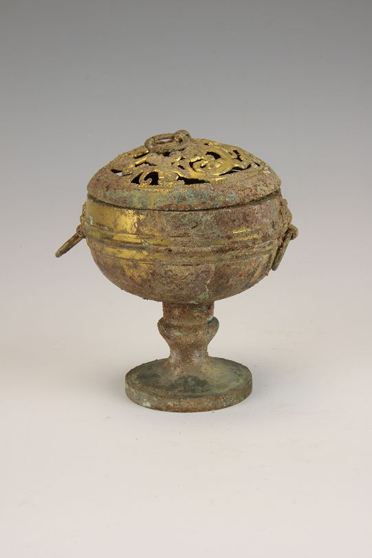 薰炉,因盖上常雕刻成峰峦状,似传闻的海上名山博山,故又称博山炉。因峰与峰之间有许多镂刻小孔,焚香时香烟从孔中喷出,又称香炉。它的用途主要为薰衣,古时由于没有香水、香料,在社交活动中,将衣服薰香,不失礼节。其次古人读书做文章,都必焚香,以除室内异味,提神健脑。还可做供神祀佛之用,朝拜宗庙与神佛时,必焚香薰之,以表示对祖辈或神佛的尊敬、信奉。西汉中期开始铸造薰炉,盛行于东汉至晋代,其造型简单古朴,形式多样,有的通体鎏金,显得富贵华丽。