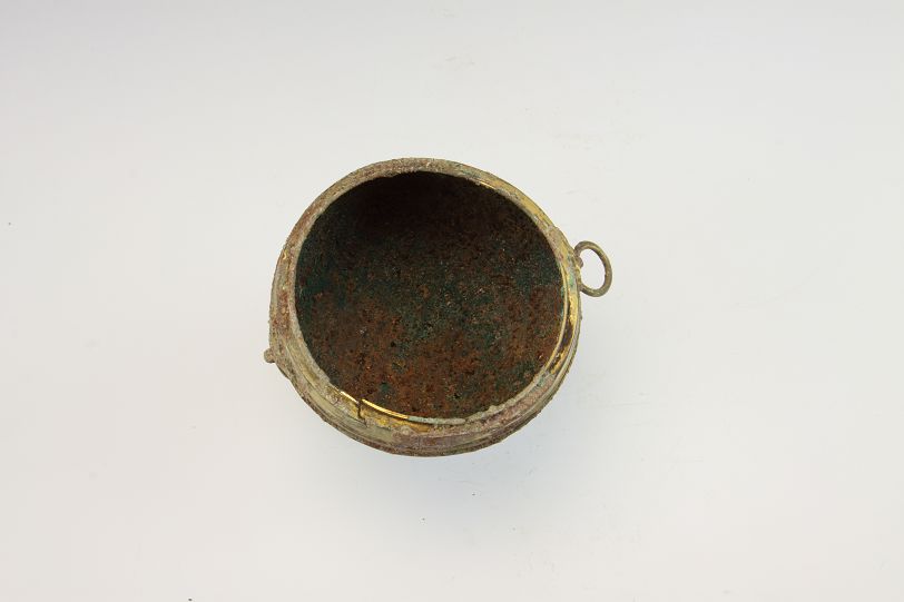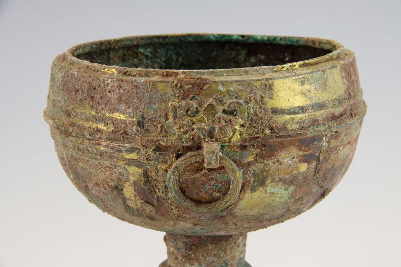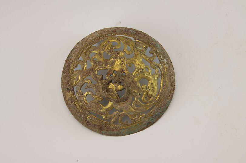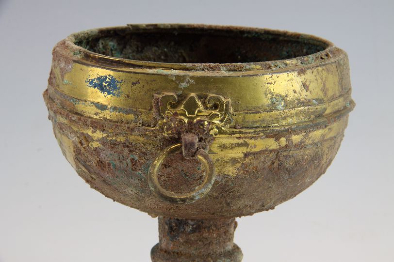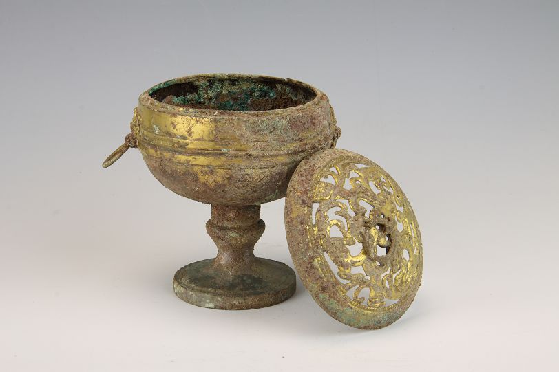 平度市博物馆馆藏汉代鎏金铜薰炉是博山炉的一种,2000年出土于平度市灰埠镇界山汉墓。薰炉口直径10.4厘米,底直径7厘米,高15.4厘米。通体表面鎏金,上有镂空的圆弧形盖,以便香烟缭绕,盖面镂雕三组龙纹,炉身为豆形,子母口,弧腹较深,腹部附二铺首衔环,长柄,圈足;柄上部较直,中部鼓出,近圈足处向内弧收。该薰炉制作精美,造型古朴,具有较高的研究价值和收藏价值。