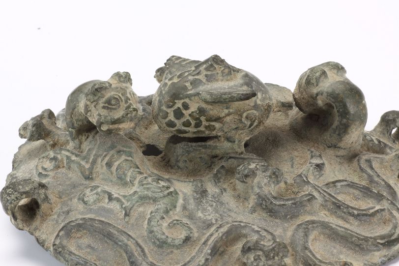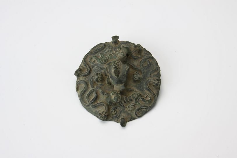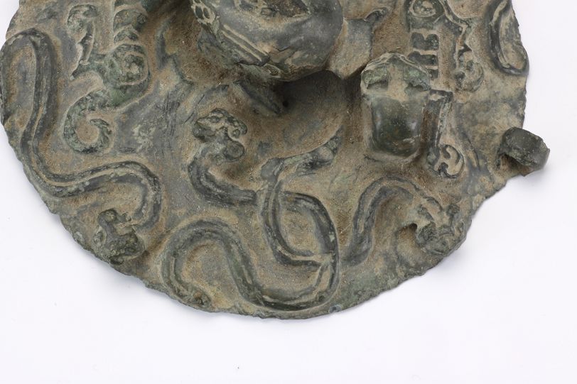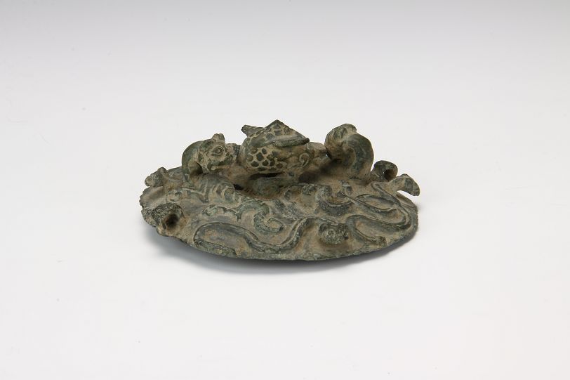 平度市博物馆馆藏春秋时期龙虎纹铜罐,1968年,出土于大泽山西半坡一周代遗址。由盖和器身两部分组成,浅子母口,口微收。盖中央有一兽钮,饰有鳞纹,因残缺,不可确认。两边各有一卧虎,虎身为浮雕,立体虎头,望向兽钮。有龙6条分置两边,龙身浮雕,立体龙头。3条一组,其中两条相交。盖的边缘有两个对称钮环。溜肩,肩部有两个耳环。圆腹,饰有龙32条,分上下两层,错位分布,每层16条,两两相交,浅浮雕虎身,立体虎头。圜底高足。该罐造型端庄敦厚,铸造精致,纹饰繁复,给人一种神秘威严的感觉。