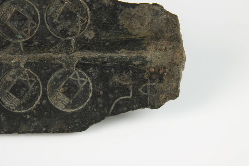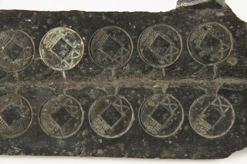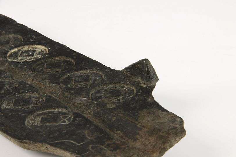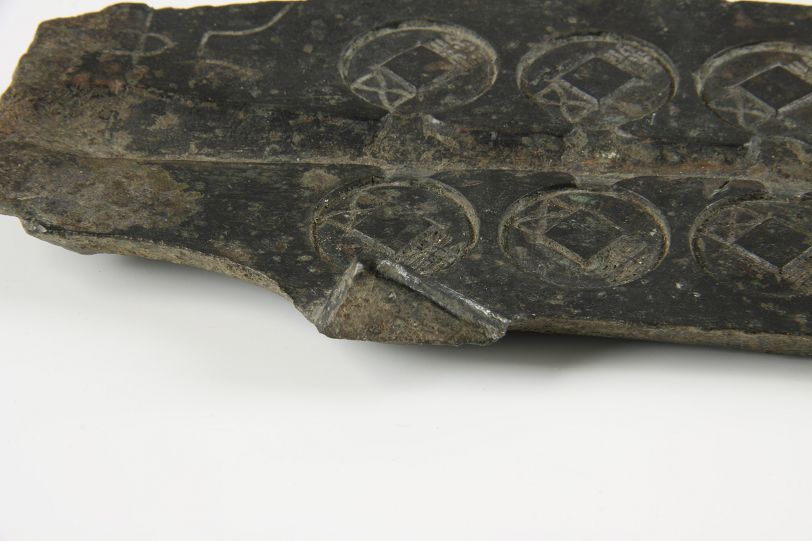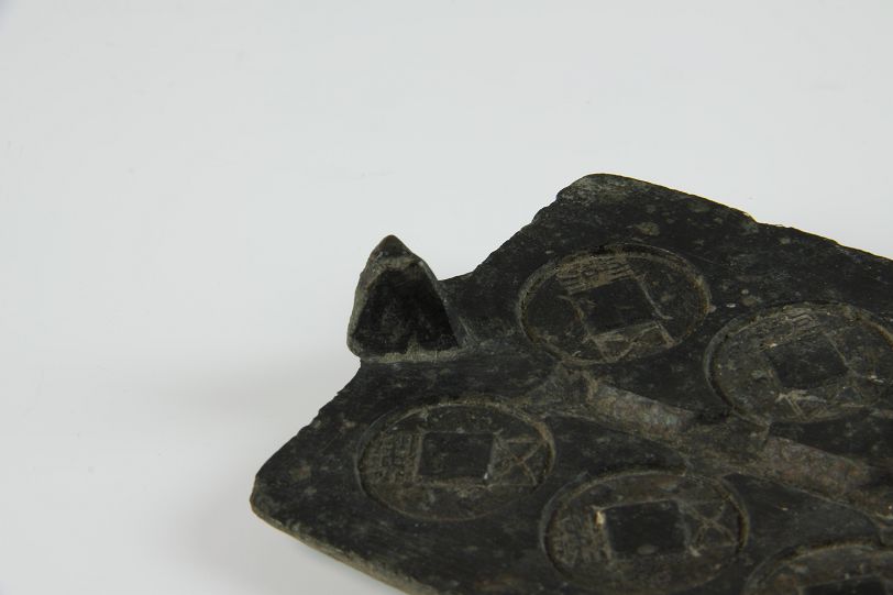 平度市博物馆馆藏汉代武帝时期五铢铜钱范,70年代征集于古岘镇 。钱范长24厘米,宽9厘米,厚2.7厘米。钱范右上角阴刻“廿九”两字,“廿九”应是钱范的编号。钱范呈长方形,中间有一凹槽,可浇灌铜液,凹槽两边各排列6枚五铢钱模,字口清晰,无一损伤。底部和右边留有挡榫,便于合盖。这件铜钱范保存至今,极为珍贵,对研究古代经济制度、钱币历史具有重要的学术和研究价值。