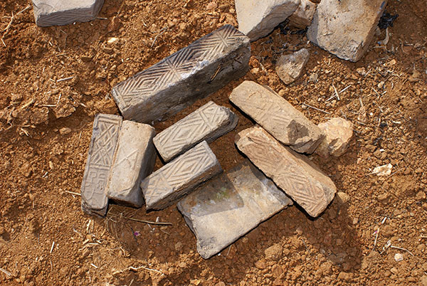 古墓群范围内可见着大量的汉砖,有棱纹、五铢纹、卷云纹、太阳纹、鱼纹、凤纹、文字砖,尤棱形纹砖最多。文字砖有篆书吉语“子孙大吉”四字,并未发现年号。此古墓群面积大,分布广,有些墓室塌陷暴露,砖整齐的裸露在外面。