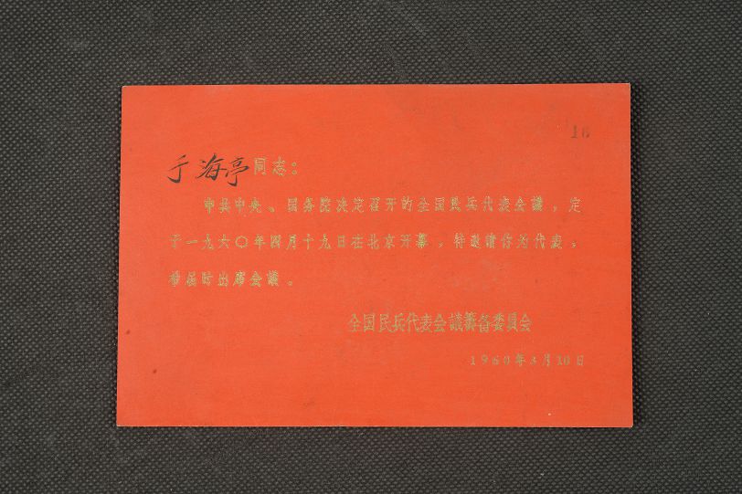 1960年于海亭出席全国民兵代表会议请柬(资料)