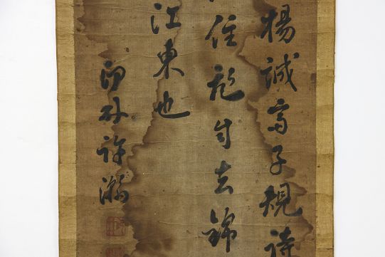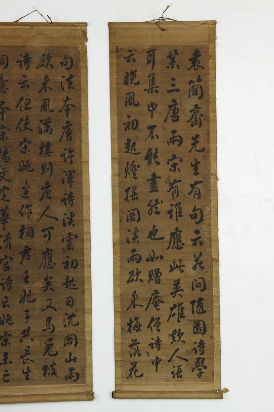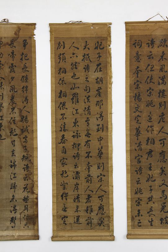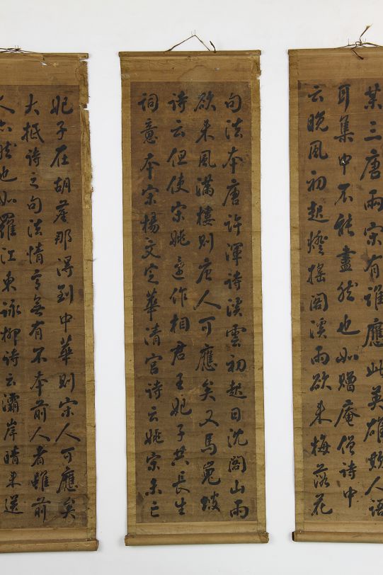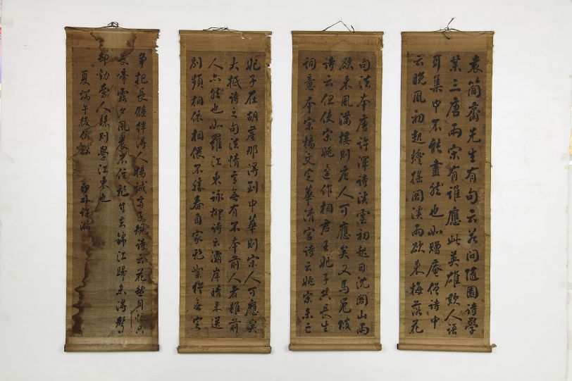 平度市博物馆馆藏行书四条屏,60年代征集于民间 。此四条屏每件高83厘米、宽23厘米,纸本,行书。书法尊奉颜体,丰肥端庄,通劲遒健。许瀚跟著名书法家何绍基交往很深,并深受其影响,书法的用笔结体中不免有何绍基浓厚的影子,但其用笔又避开何绍基的颤抖之法,显得沉稳隽永,率朴自然。
