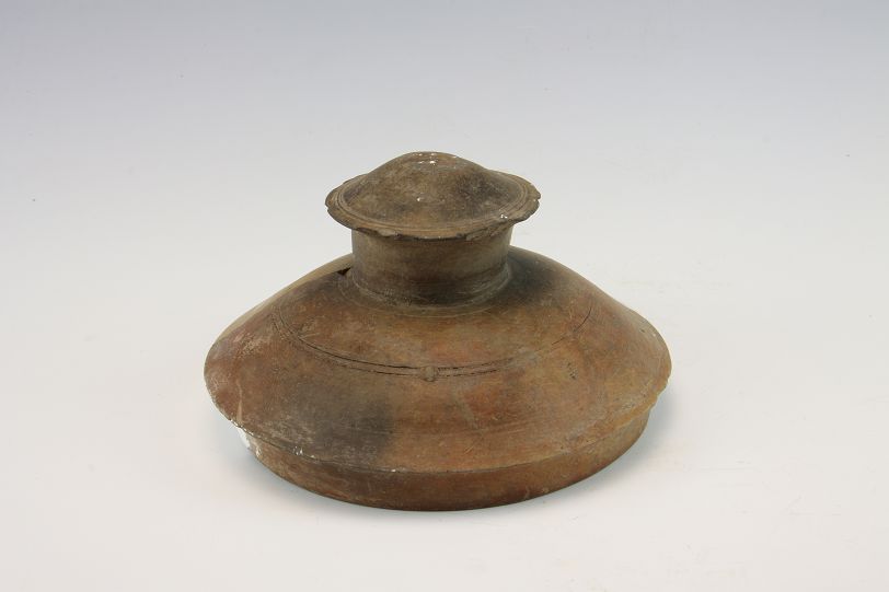 平度市博物馆馆藏蘑菇钮器盖,是岳石文化特有的器物之一,出土于1993年平度市大泽山镇东岳石遗址第二次发掘。蘑菇钮器盖高9厘米,直径17厘米,钮直径6.8厘米,口径14.1厘米。器盖上部突出象蘑菇一样的把手,顶面沿边沿刻两条阴线,圆晕光滑。岳石文化不少陶器都有了子母口的设计,显然是为了加盖的方便,既可以保温,又比较卫生。这种陶器制作非常精细,经过淘洗和磨光,采用这种技艺不仅为了美观,更重要的是可以大大降低陶器的透水性,避免和减少液体的挥发。考古专家推测,有如此精美器盖的陶器,很可能是用来存放酒的器具。