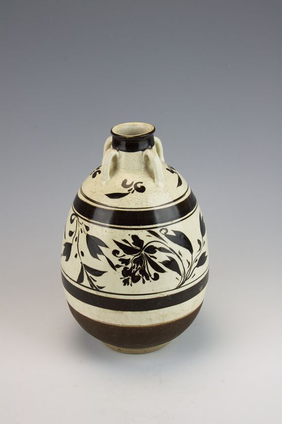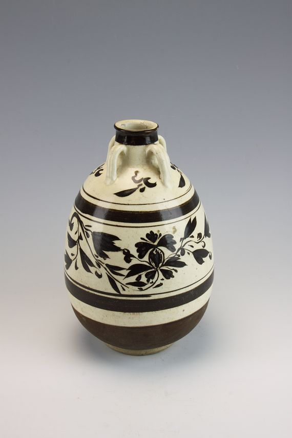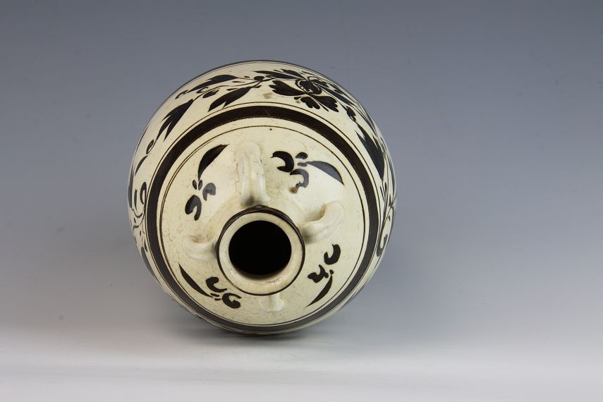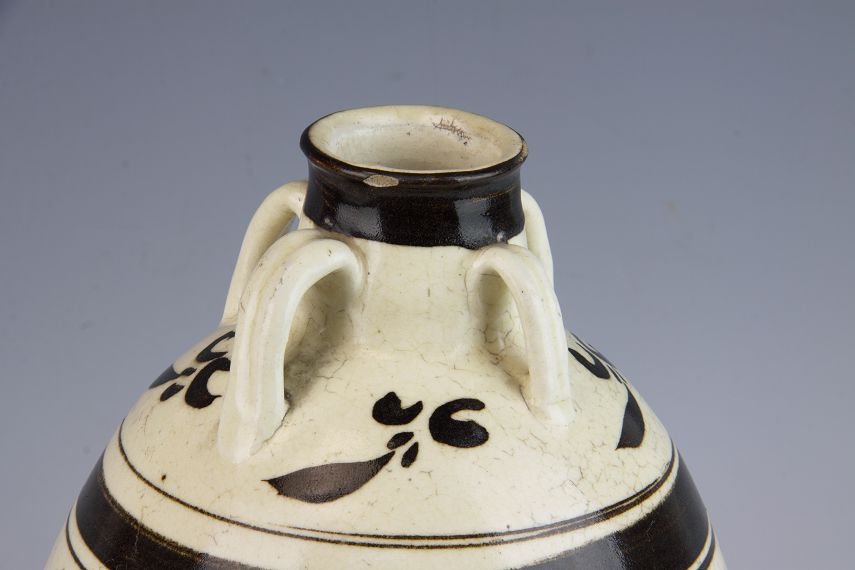 平度市博物馆馆藏元白釉黑花四系罐,旧藏,出土地点不详。微侈口,薄唇,直颈,溜肩,肩颈饰有四系,对称分布。四系为白釉,四系上部到口沿为黑釉。大肚,白釉黑花相间,四系下部到罐肩部为花叶纹,腹的上下各为一周黑釉,腹中部为大叶黑花纹。腹下部饰有褐色釉。小圈足。