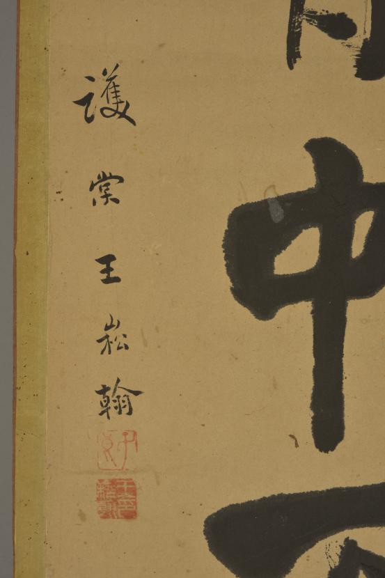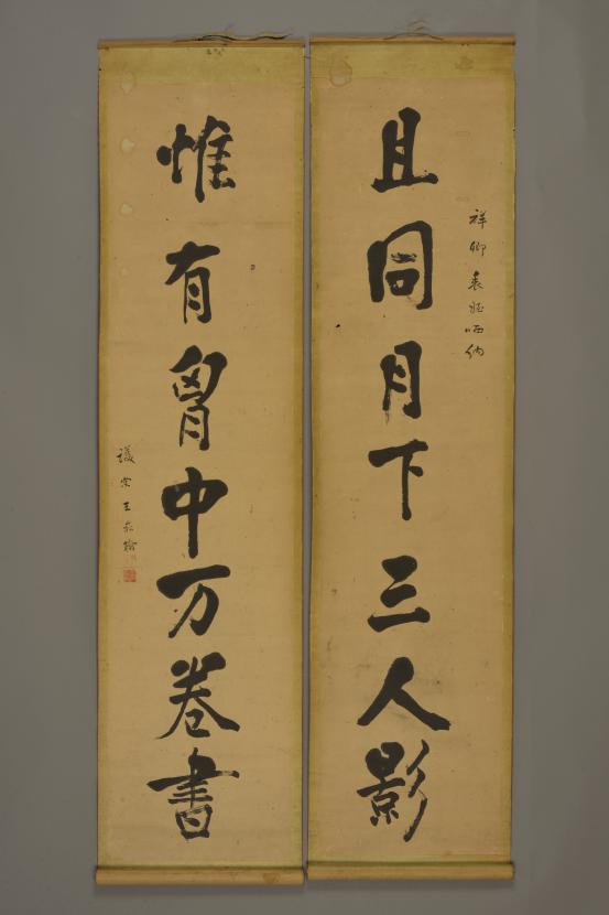 平度市博物馆馆藏王崧翰行书七言联,60年代征集于民间。此联为纸本,高130厘米,宽31厘米。上联“且同月下三人影”, 下联“惟有胸中万卷书”,上款“祥卿表侄哂纳”,落款“护棠王崧翰”,上钤印朱文“子良”,下钤印白文“王崧翰印”。其书法学李北海、颜鲁公,书法结字平稳,用笔沉实,雍容大方,遒劲敦厚,信笔挥洒,颇具文人风度。
