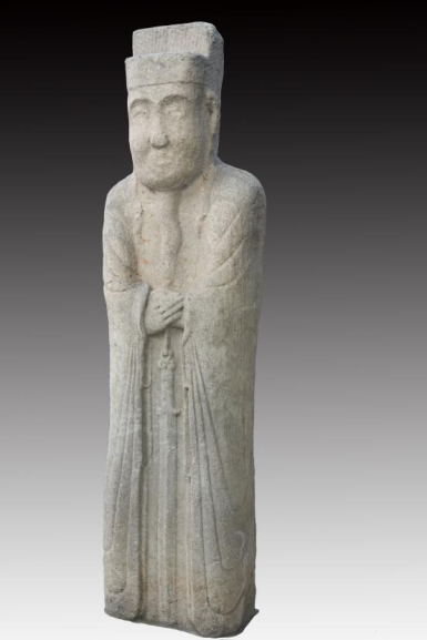 平度市博物馆馆藏元代石翁仲,为元代昭武大將軍崔世荣墓前遗物。崔墓位于店子镇昌里村南,文革前被平毁,只有墓碑和这尊石翁仲留存。石翁仲高2.01米,宽0.57米,头戴魁冠,身穿魁袍,双手按剑,肃穆而立。该石翁仲是由整块汉白玉石雕刻而成,身材高大威武,姿态端庄有力,衣纹刻画简洁流畅,形象鲜明,具有较高的文物研究价值。