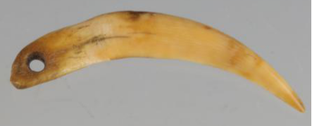 2018-01-24獐牙刀,又称獐牙勾型器。尖端磨削成弧形,根端对钻一圆孔。长7.4厘米。其用途考古学家猜测不定。有的认为是农业收割工具,但因器型限制,用力情况不够合理,已被大多数人所否定。有的认为是表明社会地位的信物,拥有者因对部落有贡献,颁发此物以示尊敬和赞誉。还有的认为,是当时人们取獐的生性猛悍特点为象征,用其牙作驱恶辟邪的瑞符。众说纷纭,至今尚无定论。