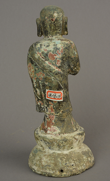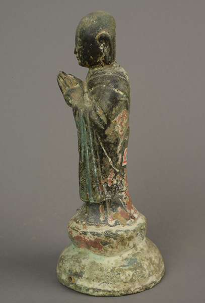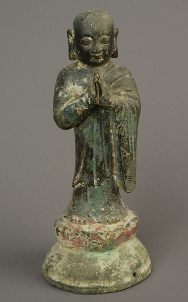 平度市博物馆馆藏宋代阿难青铜彩绘雕像,文革前出土于平度市明村镇。雕像高21.8厘米,须弥座高4.8厘米,阿难圆头大耳,体态丰润,年轻力壮,眉目清秀,神态平和,温柔敦厚。站立在须弥座上,披袈裟,下身着裙赤脚,线条流动柔和,衣褶转折自若。右肩袒露,双手合十,似在默念藏经。须弥座呈束腰仰莲式,描绘莲瓣,边缘略向外翘起,做成圆形。雕像通体彩绘,人物彩绘已脱落,唯有底座尚有斑驳痕迹。此尊造像具有很强的写实性,人物形体刻画完美。