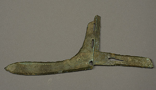 平度市博物馆馆藏战国时期青铜戈,60 年代出土于即墨故城遗址。戈长24厘米,援长14厘米,胡长7.8厘米,内长10厘米,内部三面皆有刃,似刀,内面有穿绳缚柄的三个长方形孔,以便将柄和戈头缚绑得牢固。戈身表皮锈蚀不重,斑驳绿锈,浮于表面,呈铜黄色和灰黑色,是铜锡含量较高的缘故。此戈造型挺秀爽利,保存两千余年依然坚硬锋利,应是铜戈的精品,也是战国时期青铜戈的典型款式。为研究我国古代军事史提供了重要实物资料。