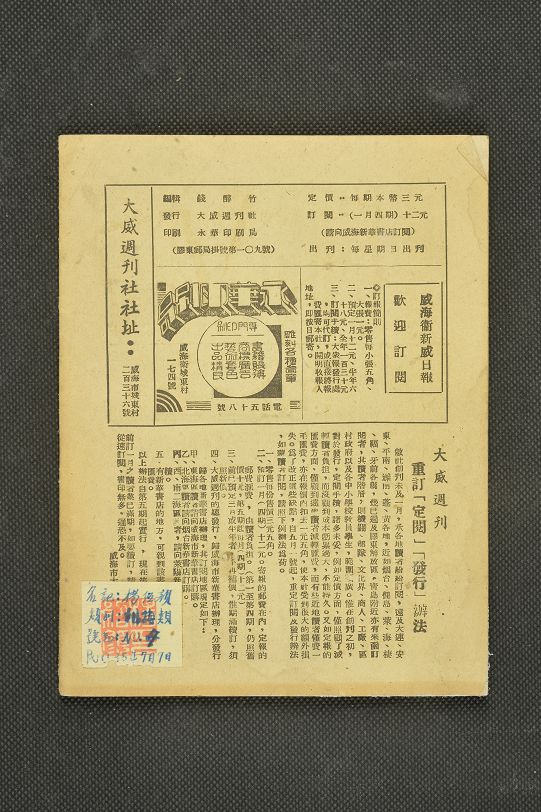 中华民国36年平南县政府指挥部联合奖状(于海亭)