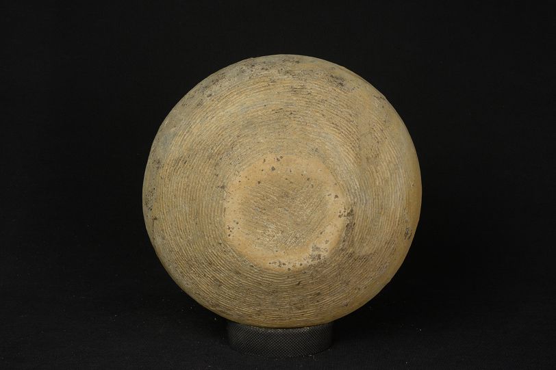 汉单孔弦纹黄陶罐